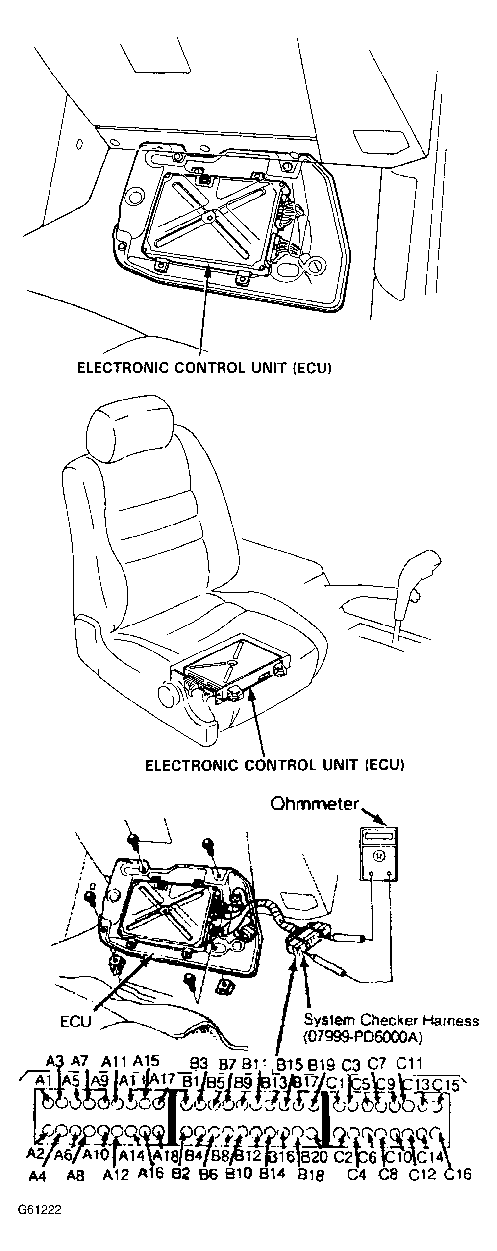 - Turn engine off and attach system checker harness between ECU and connector. Using a voltmeter, connect negative terminal to connector terminal No. A18.