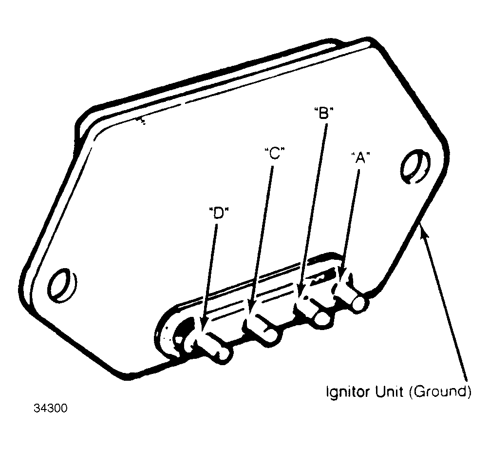 - Using an ohmmeter, check continuity in both directions between "C" and "D" terminals on ignitor output. See Fig 2. Continuity should be present in only one direction. Connect ohmmeter positive probe to "A" terminal and negative probe to ignitor unit ground. Measure resistance of ignitor input. Ignitor input resistance is 50,000 ohms or more at 70°F (20°C).
