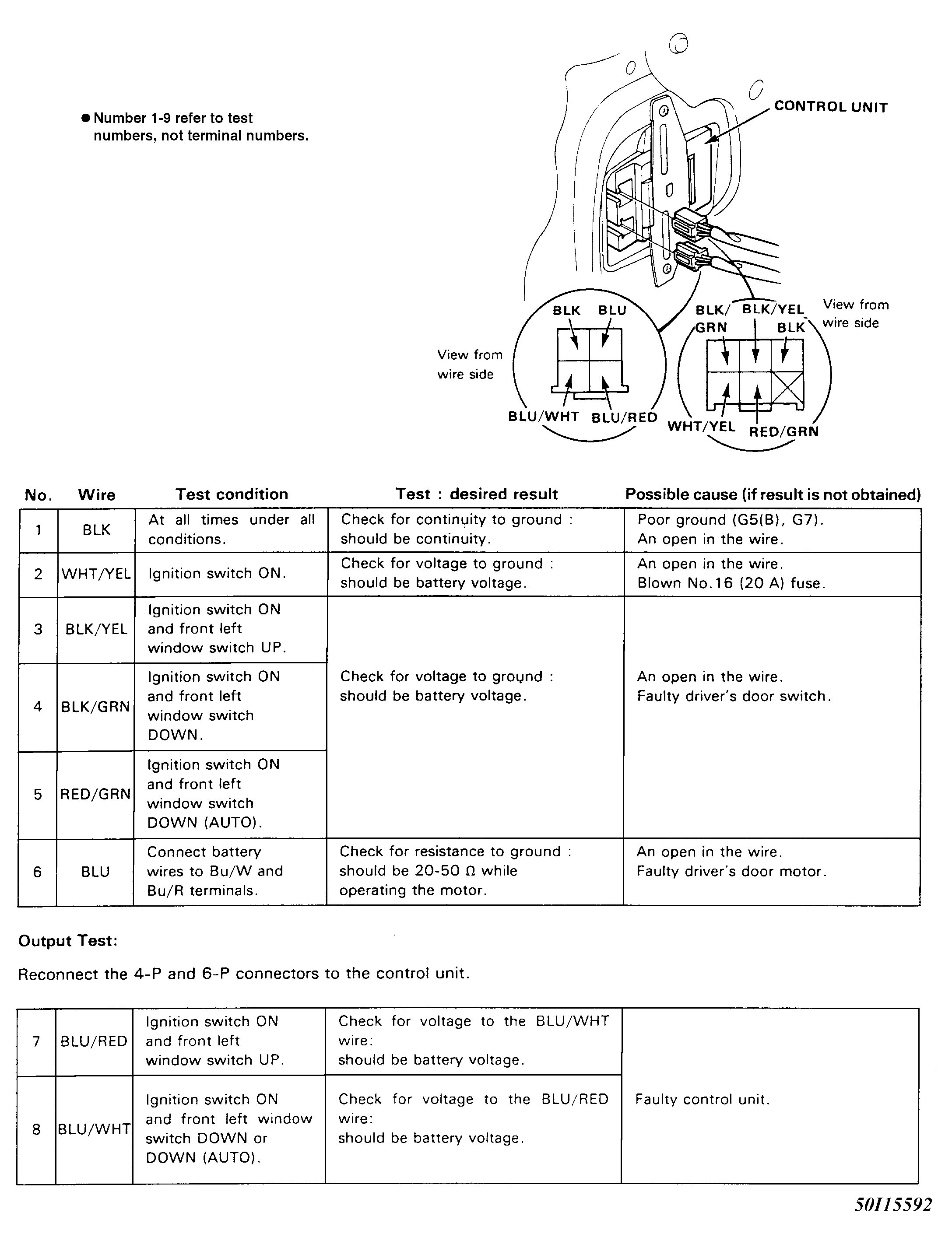 Turn ignition off. Remove driver's door panel. Unplug 4-P and 6-P connectors from control unit. Perform control unit test in Fig 1 . To test unit, keep driver's door switch connector connected with door wire harness.