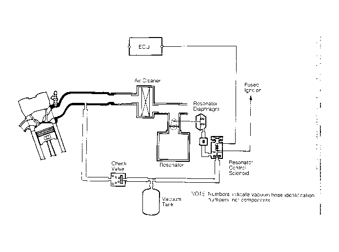 - If vacuum was not present in step 1), disconnect lower vacuum supply hose at resonator solenoid. Check for vacuum. If vacuum is not present, check for blockage in hose or vacuum port, or disconnected hose.