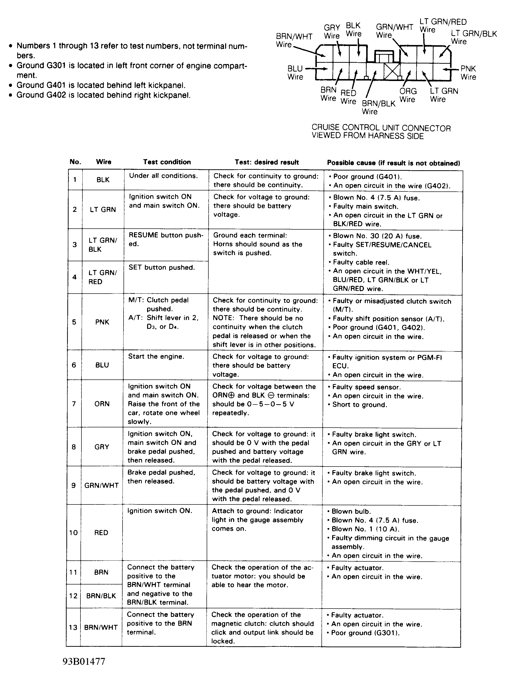 - Turn ignition off. Cruise control unit is located under instrument panel above brake pedal bracket. Disconnect cruise control unit 13-pin connector.