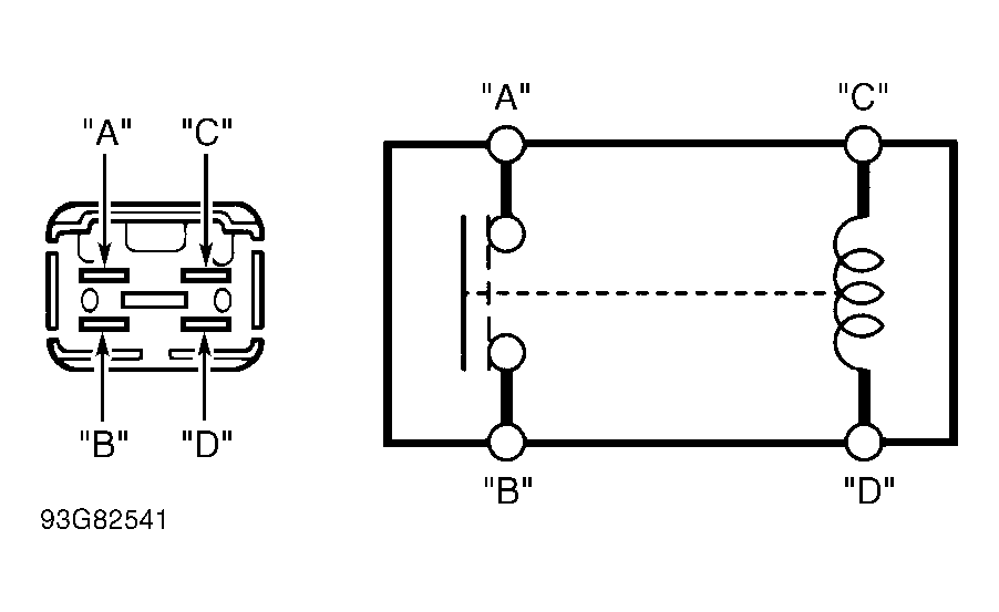Remove power window relay from underhood fuse/relay box. Check for continuity between terminals "A" and "B". Continuity should not exist. Using jumper wires, connect terminals "C" and "D" to battery voltage and ground. See Fig 1 . If continuity does not exist between terminals "A" and "B", replace relay.