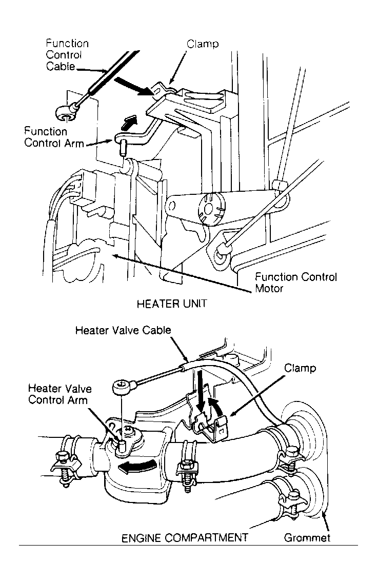 Slide function control lever to defrost position. Turn function control arm to front. Connect cable end to function control arm. See Figure. At heater assembly, slide cable housing back gently to eliminate slack, but not enough to move function control lever. Snap cable housing into clamp