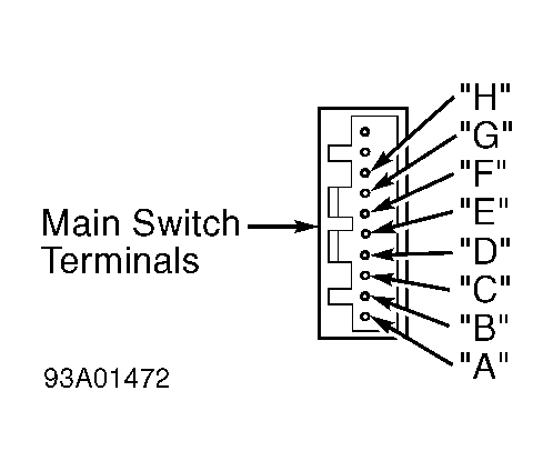 - Ensure main switch is on. Using a DVOM, check for continuity between main switch terminals "A" and "B", terminals "B" and "C", and terminals "D" and "E". See Fig 1