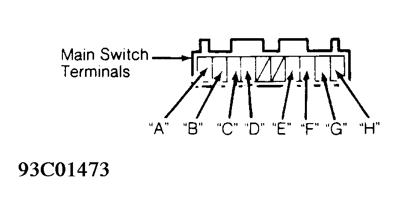- Ensure main switch is on. Using a DVOM, check for continuity between main switch terminals "A" and "B", "B" and "C", and "D" and "E". See Fig 1