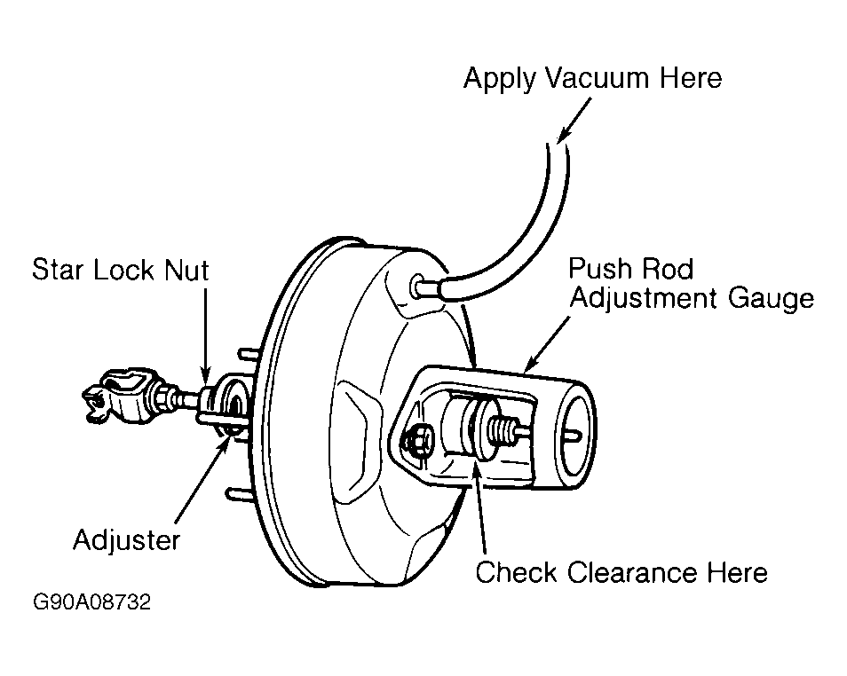 - Remove push rod adjustment gauge from master cylinder, and install it on brake booster. Tighten mounting nuts to 11 ft. lbs. (15 N.m). Using engine or outside vacuum source, apply at least 20 in. Hg vacuum to brake booster.