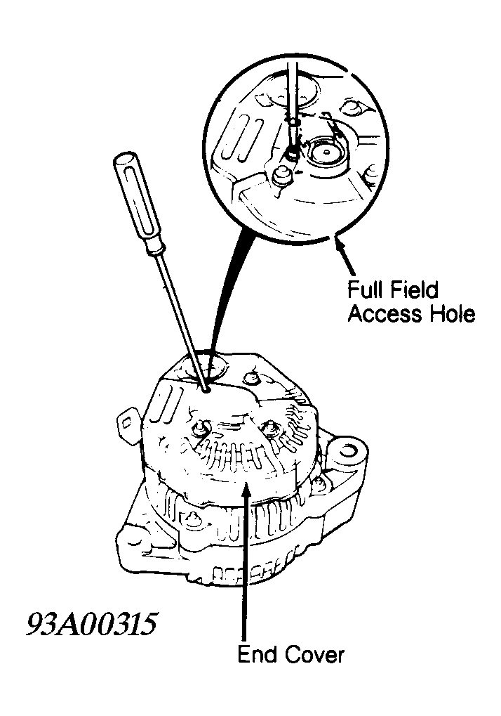 Ground regulator using metal probe through full field access hole in rear housing. See Fig 1. If amperage is 40 amps or more, replace voltage regulator. If amperage is less than 40 amps, replace alternator.