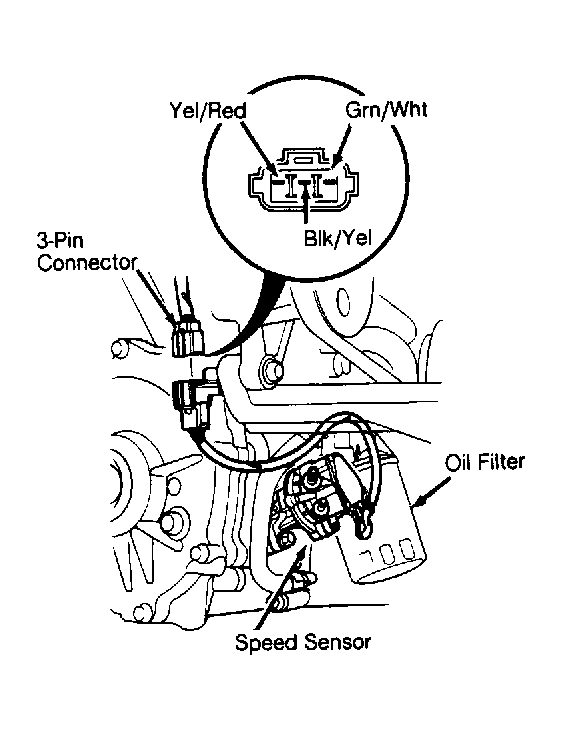 - Verify fuse No. 22 in underdash fuse block is okay. Speed sensor is located next to oil filter. Unplug 3-pin connector from speed sensor.
