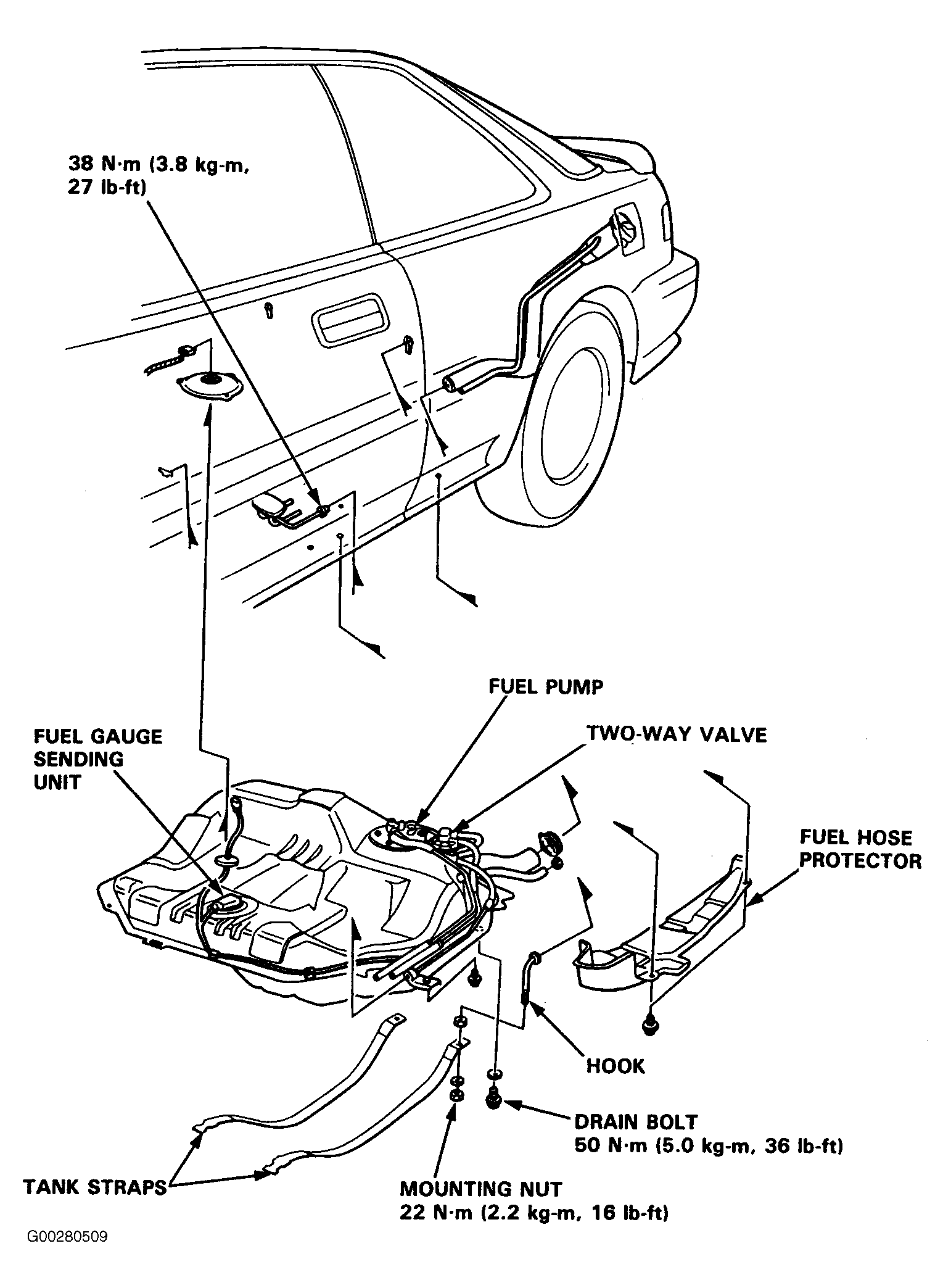 - Install a new washer on the fuel tank drain bolt. For installation, reverse removal procedure.