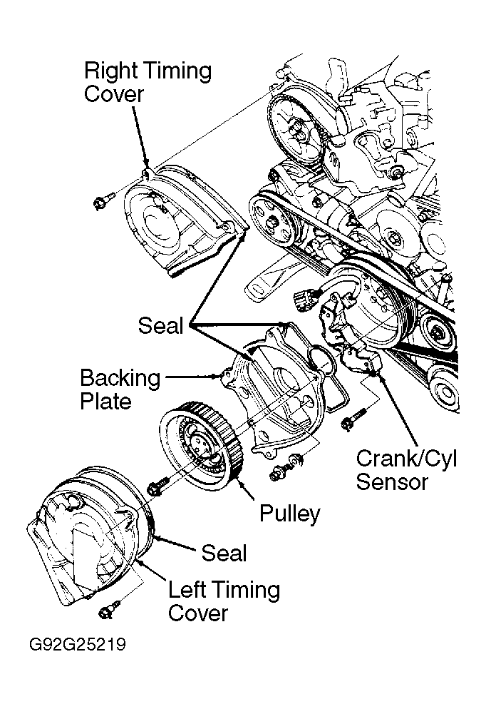Rotate engine clockwise until No. 1 piston is at top dead center. Remove upper timing belt covers. See Fig 1. Remove timing belt from camshaft pulleys. Remove left camshaft pulley. Remove left backing plate. Remove CRANK/CYL sensor. To install, reverse removal procedure.