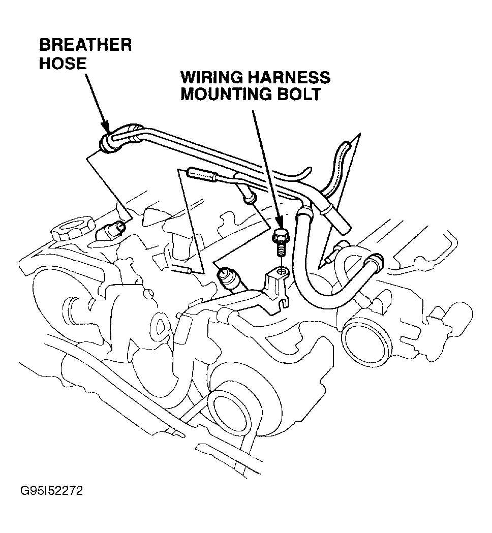 - Remove the breather hose. Remove the wiring harness mounting bolt. Move the wiring harness out of the way. See Fig 1