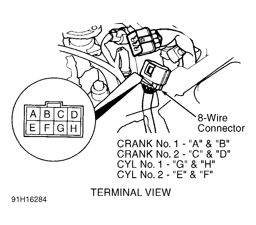- Using a DVOM (preferably with bar-graph function) on low-volt scale, check each sensor for pulse voltage signal at indicated ECU harness terminals with engine cranking. See ECU INPUT SIGNAL & RESISTANCE TEST TERMINALS table. See Fig 1 for ECU terminal identification. If pulse signal is present, sensor is okay. If pulse signal is not present, go to step 3).