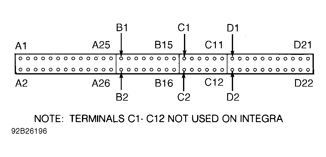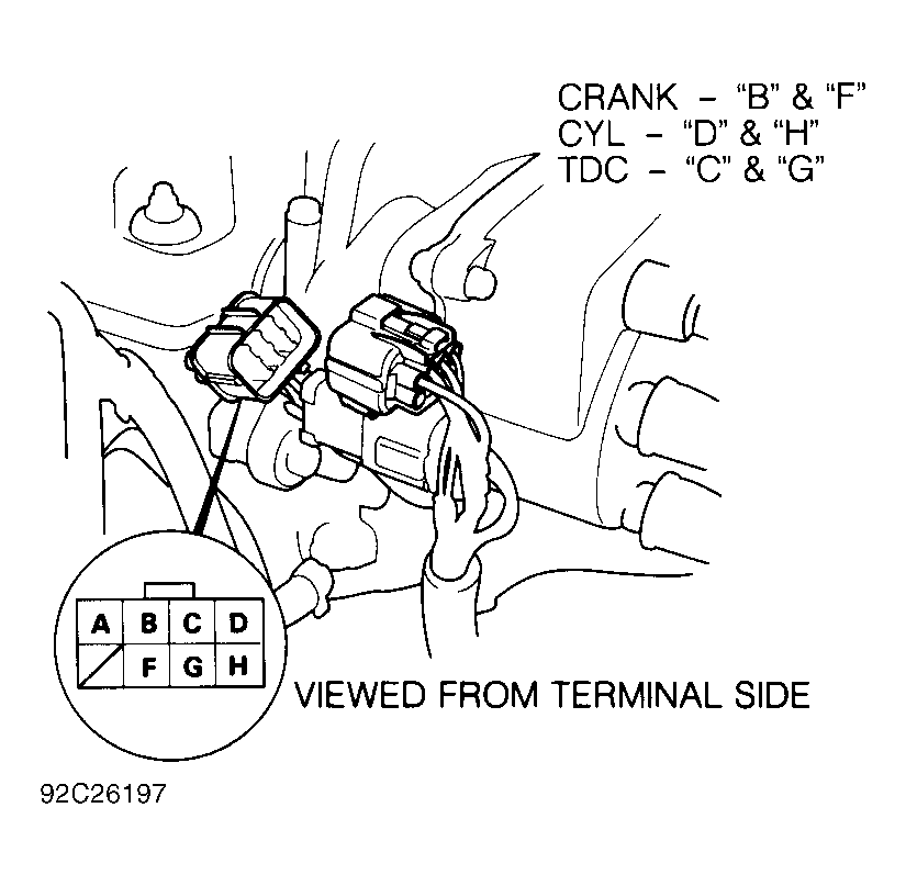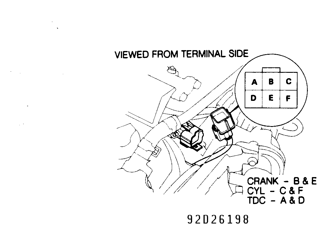 Application ECU Terminals Ohms Integra CRANK B15 & B16 350-700 Ohms CYL B11 & B12 350-700 Ohms TDC B13 & B14 350-700 Ohms Legend CRANK No. 1 B15 & B16 650-900 Ohms CRANK No. 2 B14 & B13 650-900 Ohms CYL No. 1 B12 & B11 650-900 Ohms CYL No. 2 B9 & B10 650-900 Ohms Vigor CRANK B15 & B16 650-850 Ohms CYL B11 & B12 650-850 Ohms TDC B13 & B14 650-850 Ohms - Check continuity to ground on each terminal. If continuity exists, disconnect sensor connector, and recheck appropriate ECU terminal for continuity to ground. If continuity still exists, repair short to ground in harness. If continuity does not exist, replace sensor assembly.