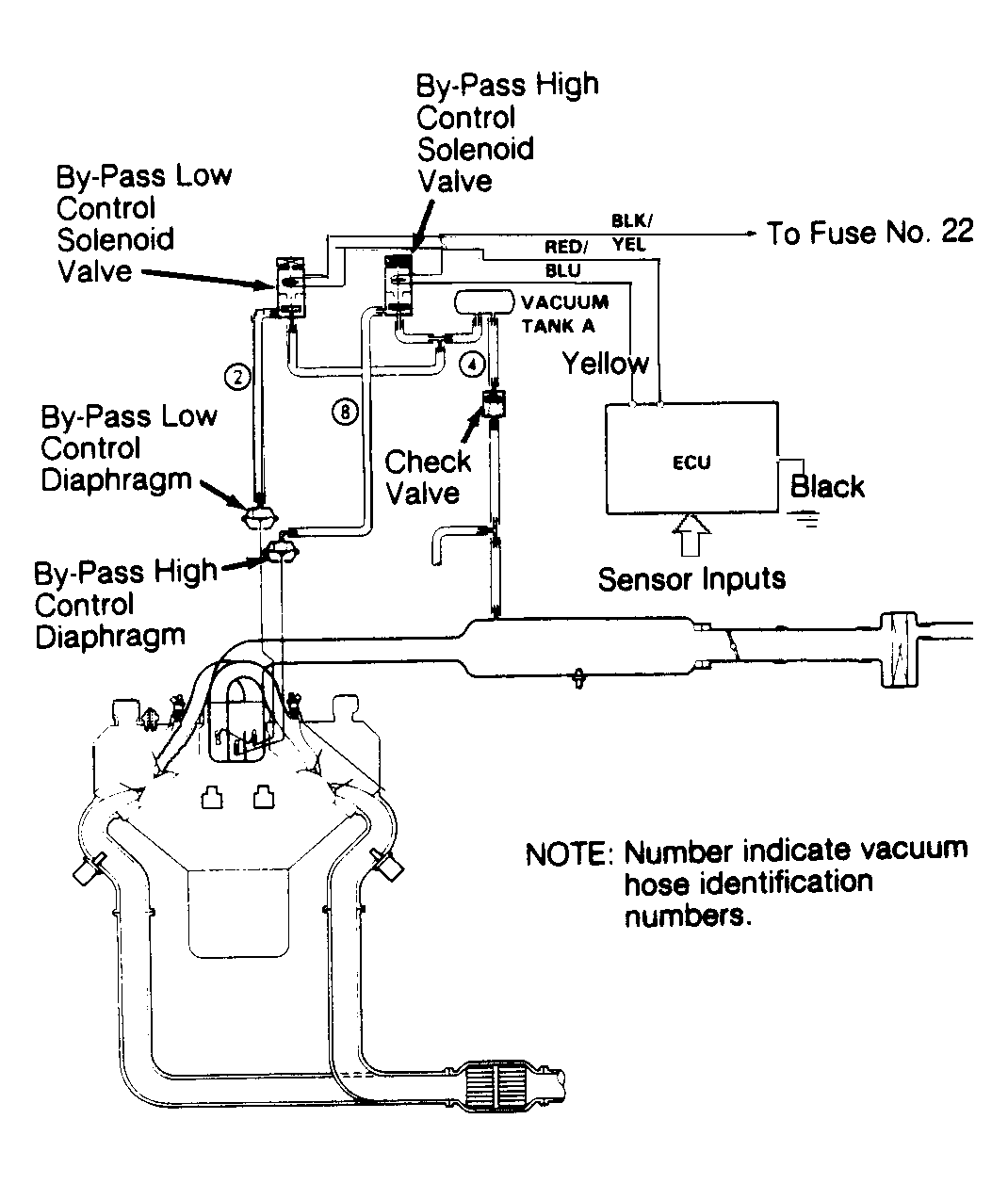 - Increase engine speed to 4000 RPM. Check for vacuum at hose No. 8. If vacuum is not present, system is okay. If vacuum is present, go to step 18).