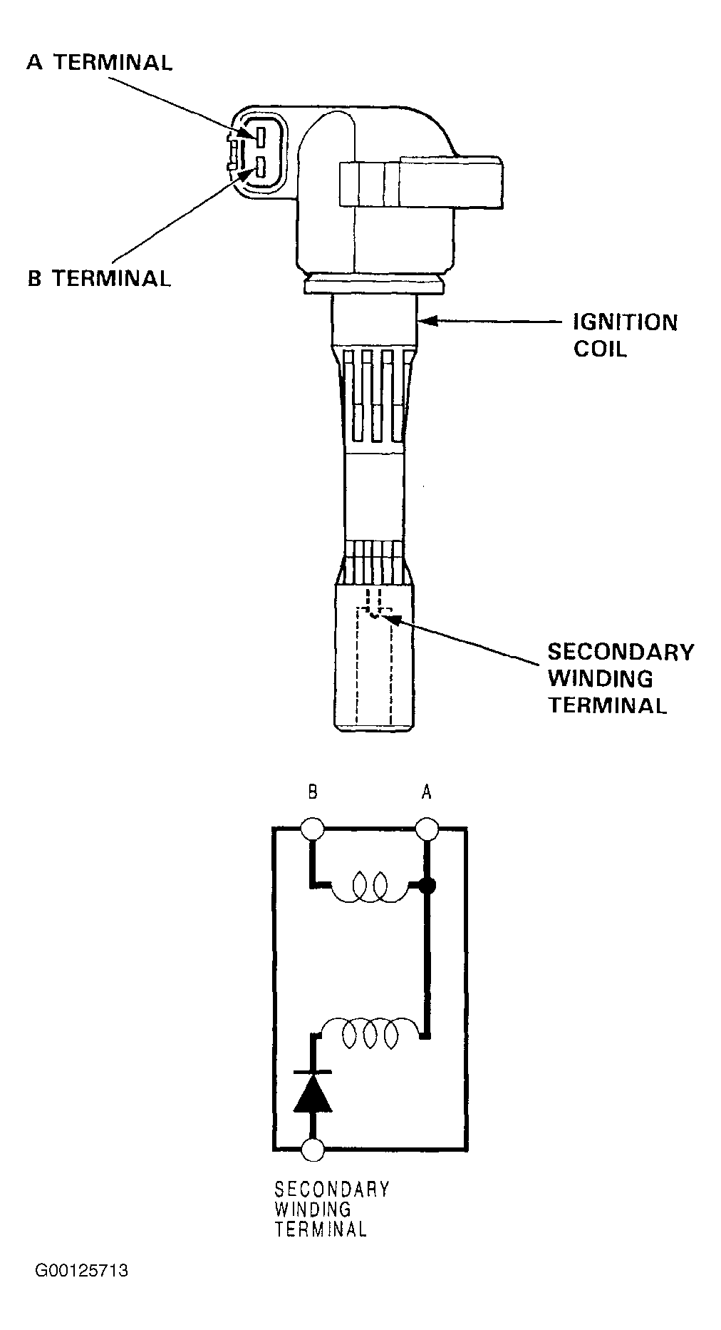 Turn ignition to OFF. Remove ignition coil and disconnect connector. Using ohmmeter, check primary resistance between coil terminals "A" and "B". See Fig 1 . Resistance should be 0.9-1.1 ohms at 77° F (25° C).