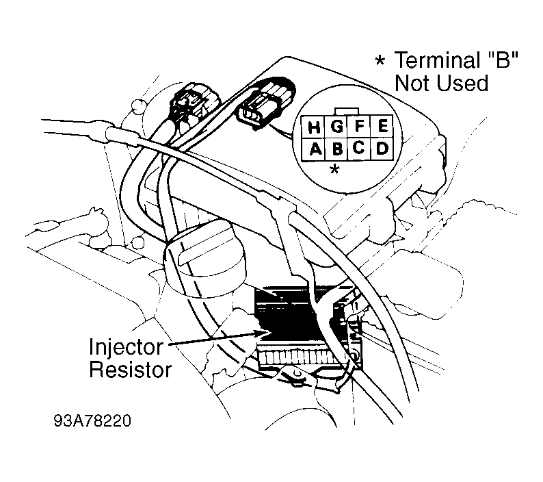 - Measure resistance between terminal "E" and all other terminals. See Fig 1 . If resistance is not 5-7 ohms, replace injector resistor. If resistance is 5-7 ohms, repair open in Red/Black wire between 2-pin connector and injector resistor.