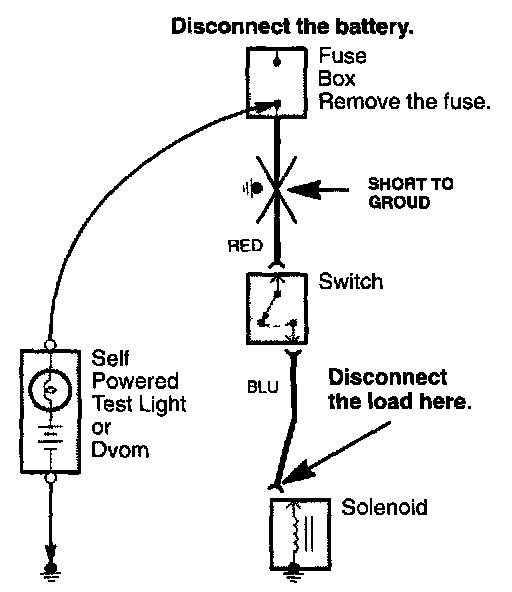 5. If the self-powered test light goes on or the DVOM displays a low reading or no reading (ZERO), there is a short to ground in the wiring near that point.