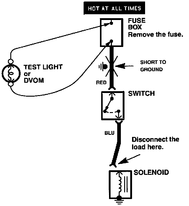 4. Where the test light goes OFF, or the DVOM voltage drops to ZERO, there is a short to ground in the wiring near that point.