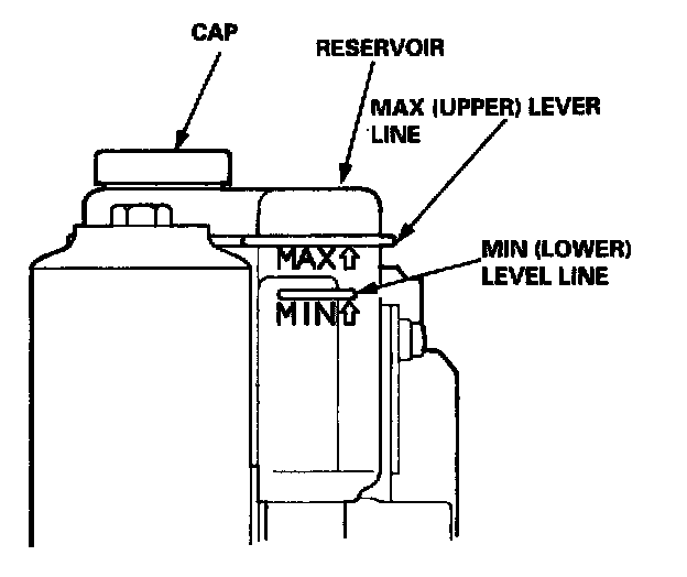 11. Check the brake fluid level in the reservoir. It should be below the MAX (upper) level line. Refill the reservoir with fresh brake fluid to the MAX level line again.