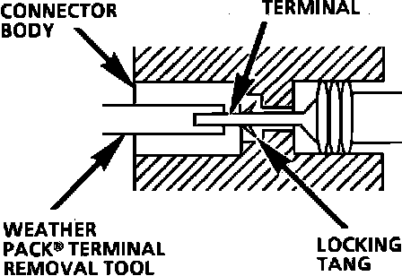 4. Insert the Weather Pack(R) terminal removal tool into the front (mating end) of the connector cavity until it rests on the cavity shoulder.