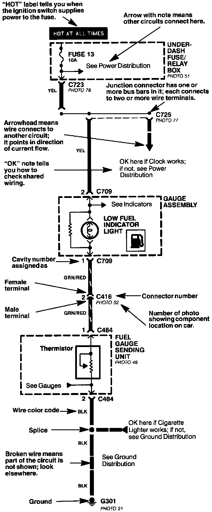 Other circuits may share power or ground terminals or wiring with the circuit shown. A wire that connects one circuit to another, for example, is cut short and has an arrowhead at the end of it pointing in the direction of current flow. Next to the arrowhead is the name of the circuit or component which shares that wiring. To quickly check shared wiring, check the operation of a component it serves. If that component works, you know the shared wiring is OK.