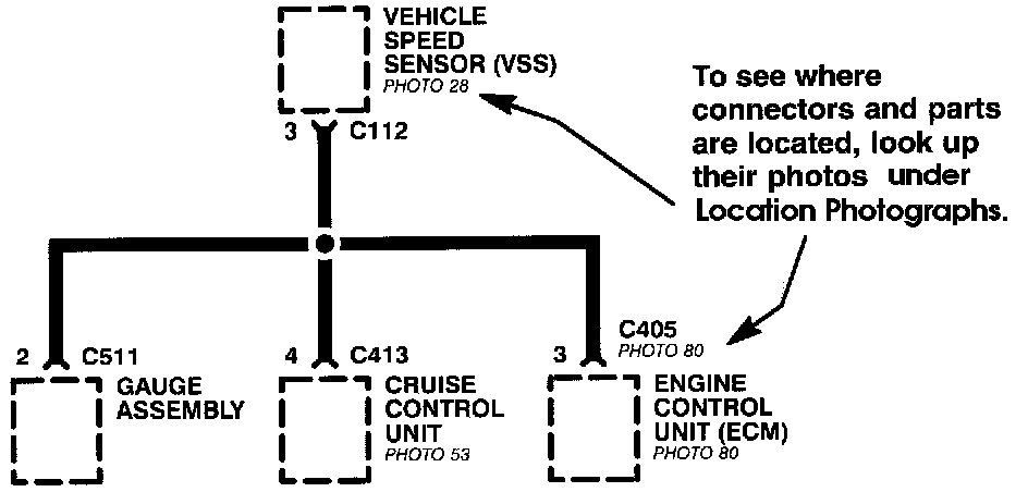 To see where a component or connector is located on the car, look up its photo number in the Component Location section. The photo will also tell you the color of the connector, and how many cavities it has.