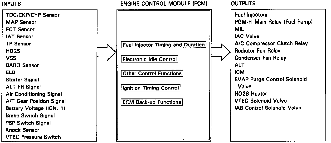 The PGM-FI ECM compares input signals with those stored in memory to determine what steps should be taken to achieve maximum performance, fuel economy, and meet emission standards. The PGM-FI ECM outputs the necessary signals to the fuel system, ignition system, air control system, and the emission control systems.