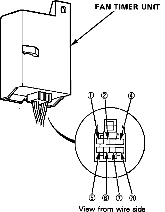 7. Check terminal No. 1 for battery voltage, voltage should be indicated, if not replace fan timer unit, before connecting new timer check continuity between YEL/WHT wire and ground. If continuity is indicated, do not connect new timer as damage will occur.