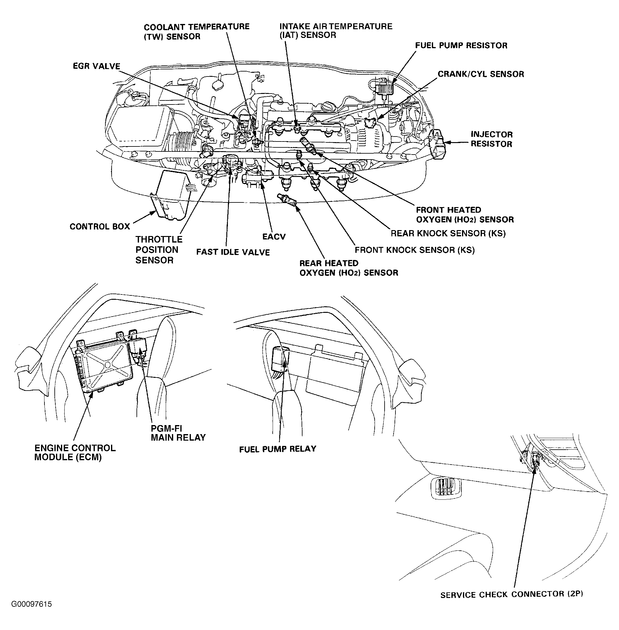 1. Remove the PGM-FI main relay.PGM-FI main relay is located behind passenger seat next to ECM. See Fig 1 .