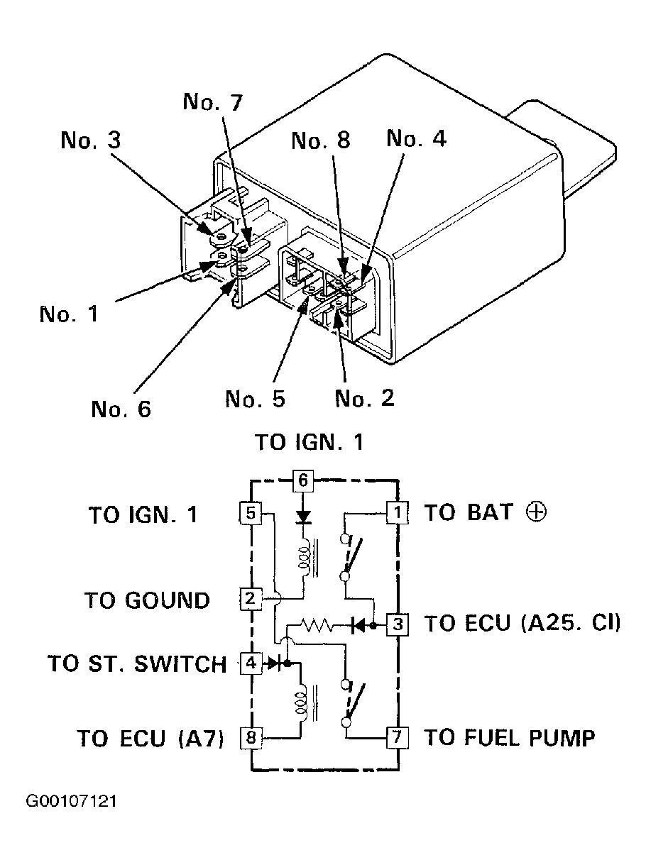 2. Attach the battery positive terminal to the No. 4 terminal and the battery negative terminal to the No. 8 terminal of the main relay. Then check for continuity between the No. 5 terminal and No. 7 terminal of the main relay. See Fig 2 . If there is continuity, go on to next step. If there is no continuity, replace the relay and retest.