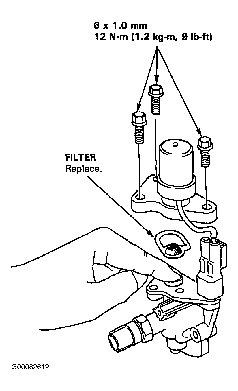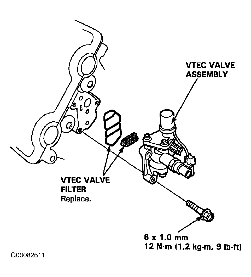 - If the resistance is within specifications, remove the VTEC valve assembly from the cylinder head, and check the VTEC valve filter for clogging. See Fig 2