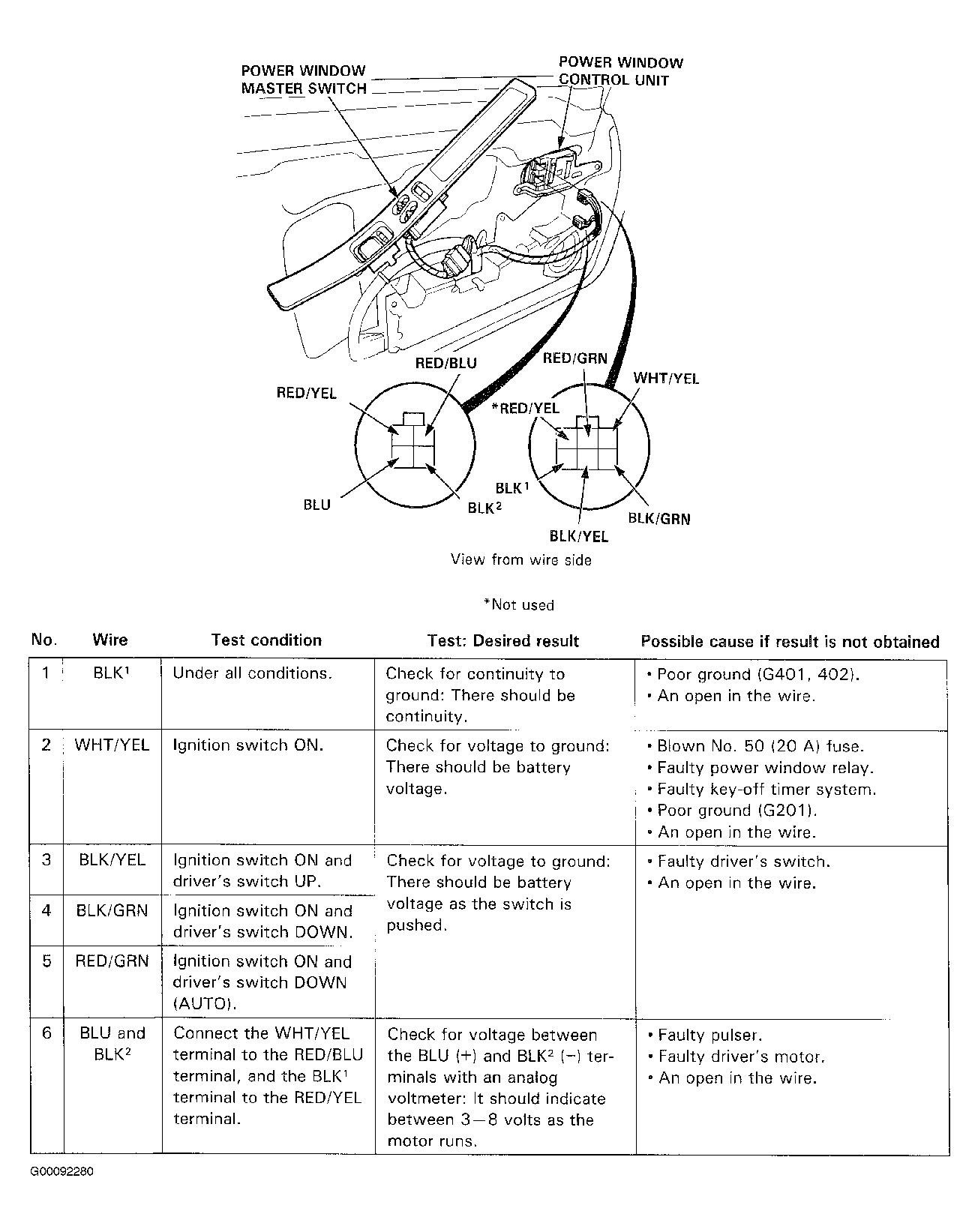 Remove the driver's door panel and disconnect the 4-P and 6-P connectors from the control unit. Inspect the connector terminals to be sure they are all making good contact.