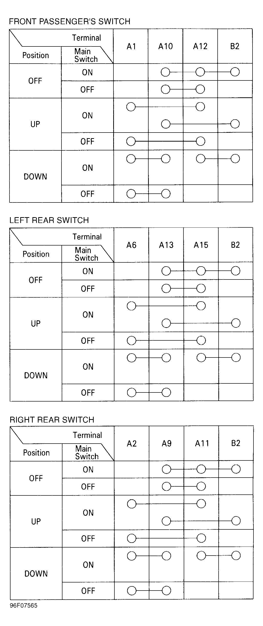 Remove power window master switch. Disconnect power window master switch connectors. SeeFigure and Fig 1 . Check continuity between specified terminals in each switch position. SeeFig 1 and Fig 2 . If continuity is not as specified, replace power window master switch.