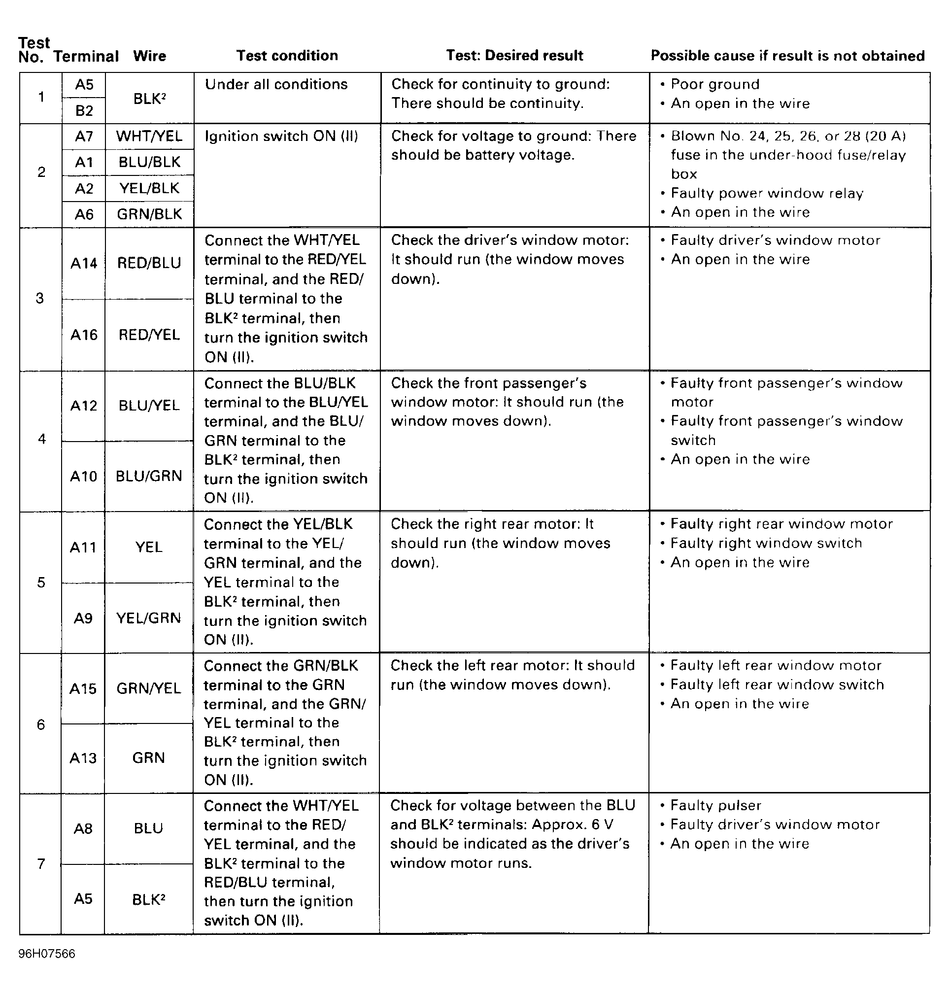 Driver's power window switch is integrated with control unit and cannot be isolated for testing. Perform driver's master power window switch input tests No. 1, 2, 3 and 7. See Fig 3