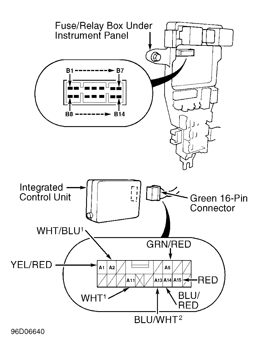 - Connect a fused jumper wire between fuse/relay box 14-pin "B" socket terminal B12 and integrated control unit Green 16-pin connector terminal A15 (Red wire). Check operation of all windows. If all windows operate, replace integrated control unit. If windows do not operate, check power window relay. See POWER WINDOW RELAY TEST