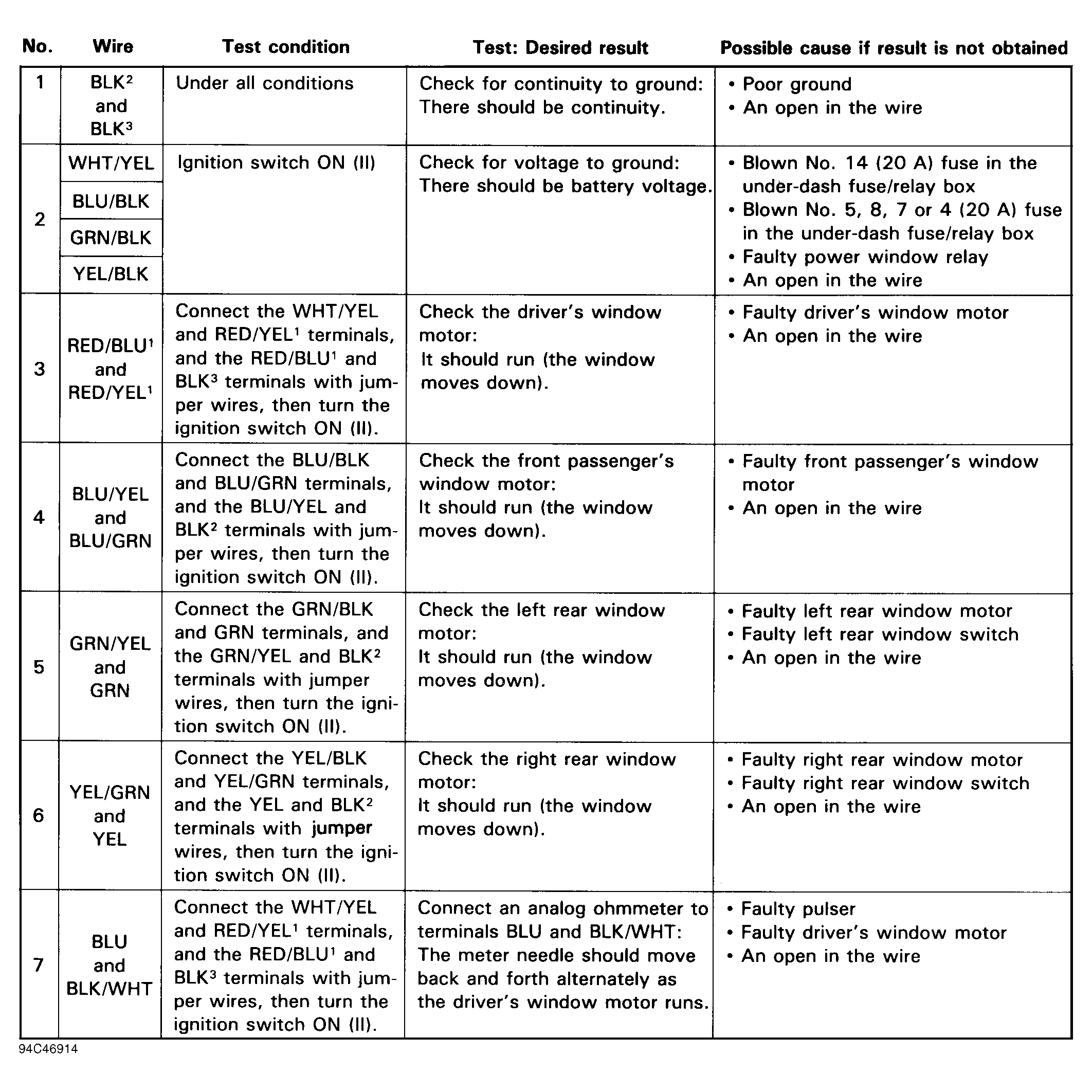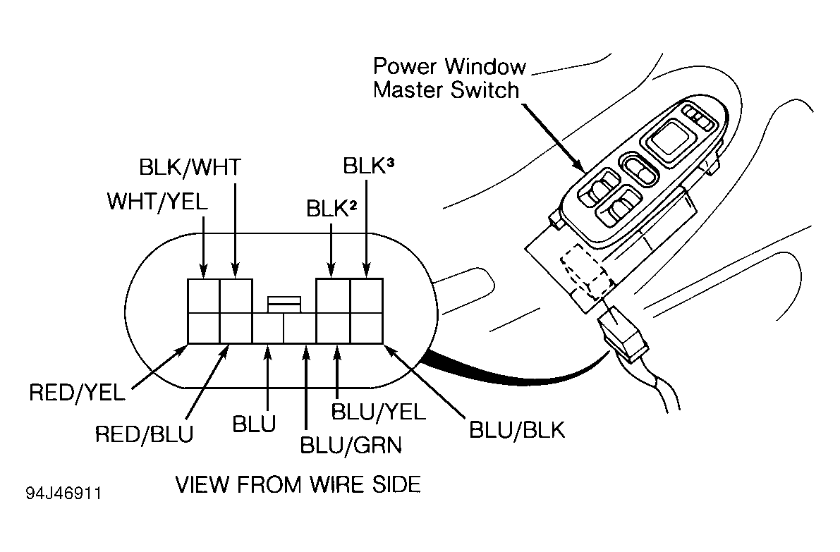 NOTE: Driver's power window switch is integrated with control unit and cannot be isolated for testing. On 4-door, perform tests No. 1, 2, 3 and 7. On 2-door, perform tests No. 1, 2, 3, and 5. See POWER WINDOW MASTER SWITCH INPUT TEST. See Figure -Figure . If inputs normal and driver's power window switch does not operate properly, replace power window master switch assembly.