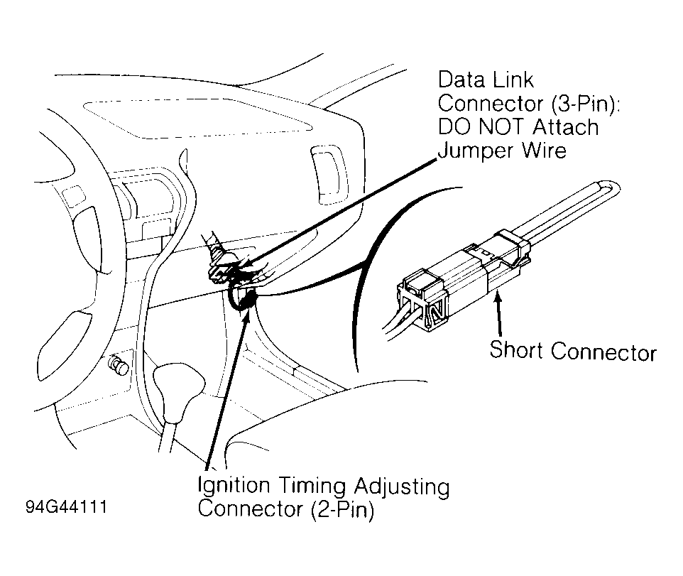 1. Operate engine until cooling fan comes on. Locate Ignition Timing Adjusting connector (2-pin). Connector is located under right kick panel. Using Short Connector (07PAZ-010100 ), connect terminals of ignition timing adjuster connector together. See Fig 1 .