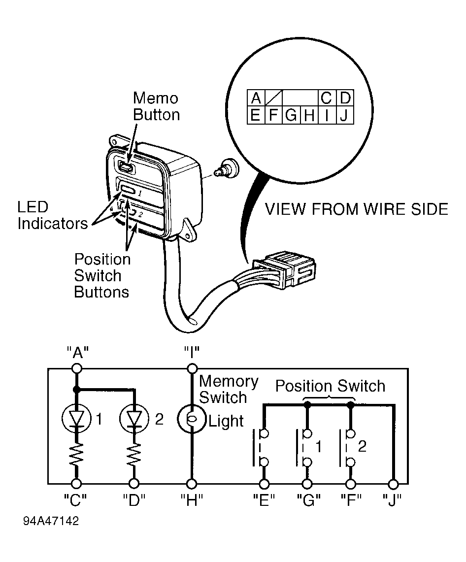 Remove driver's door panel. See DRIVER'S DOOR PANEL under REMOVAL & INSTALLATION. Disconnect driver's position memory switch 10-pin connector. Remove switch from door panel. Using an ohmmeter, verify continuity is as specified in DRIVER'S POSITION MEMORY SWITCH CONTINUITY table. See Fig 1 . If continuity is not as specified, replace faulty switch.