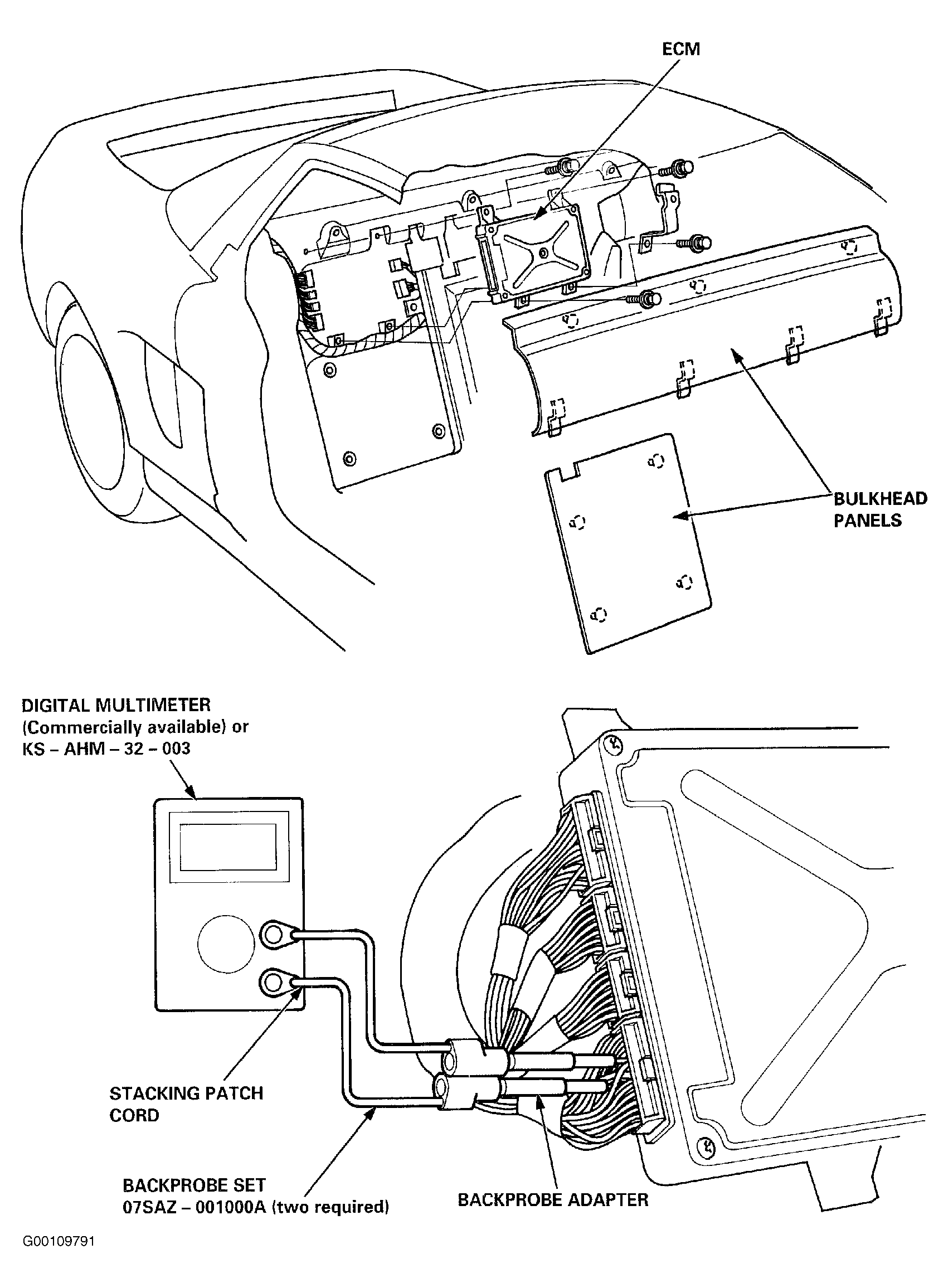 Perform all resistance and voltage tests with a Digital Volt-Ohmmeter (DVOM) with minimum 10-megohm impedance, unless stated otherwise in test procedures. If the inspection for a particular failure code requires the test harness, remove the seat back panels. Unbolt the ECM bracket to backprobe ECM connectors. Check the system according to the procedure described for the appropriate code. For backprobe procedure, see Fig 1