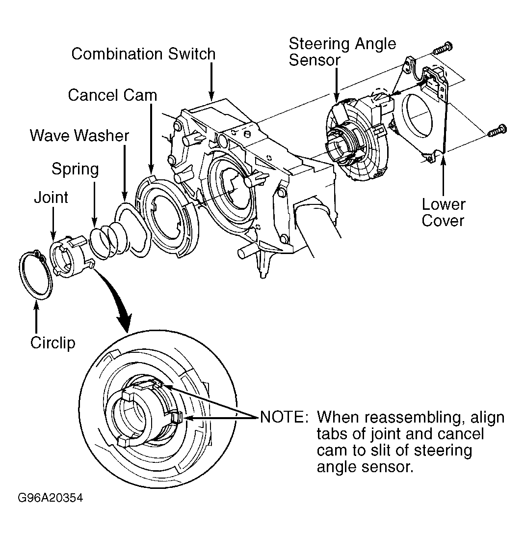Disable air bag system. See AIR BAG RESTRAINT SYSTEM article. Remove steering wheel and combination switch. See STEERING COLUMN article. Remove circlip and steering angle sensor from combination switch. See Fig 1 . To install, reverse removal procedures. DO NOT apply grease or oil to steering angle sensor. Perform steering angle sensor test and ensure proper steering angle sensor operation. See STEERING ANGLE SENSOR TEST .