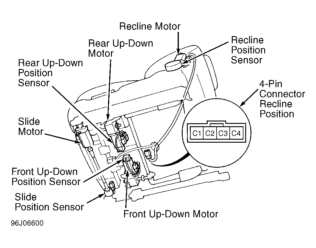 Remove driver's seat. See FRONT SEAT  under REMOVAL & INSTALLATION. Disconnect all power seat motors and sensors. See Figure . Connect battery power across motor leads. Using an analog ohmmeter, observe resistance across associated sensor terminals. Needle on ohmmeter should move from left to right. If motor does not run, reverse battery power terminals. If motor still does not run, replace faulty motor. If ohmmeter needle does not move from left to right, replace faulty sensor. Repeat this procedure for each motor-sensor combination.