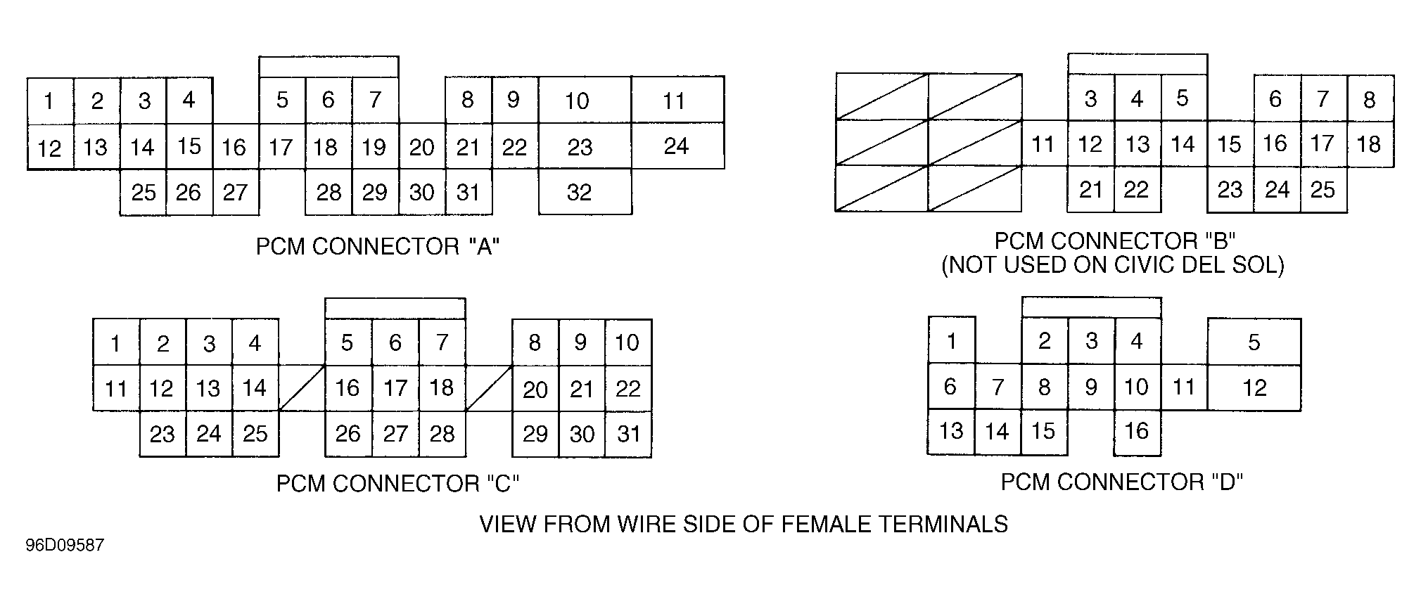 - Turn ignition off. Disconnect PCM connector "D". Disconnect alternator 4-pin harness connector. Using a jumper wire, apply ground to White/Red wire at alternator 4-pin harness connector. Check for continuity between PCM terminal C17 and ground. If no continuity exists, repair open White/Red wire between PCM terminal C17 and alternator. If continuity exists, alternator FR signal is okay.