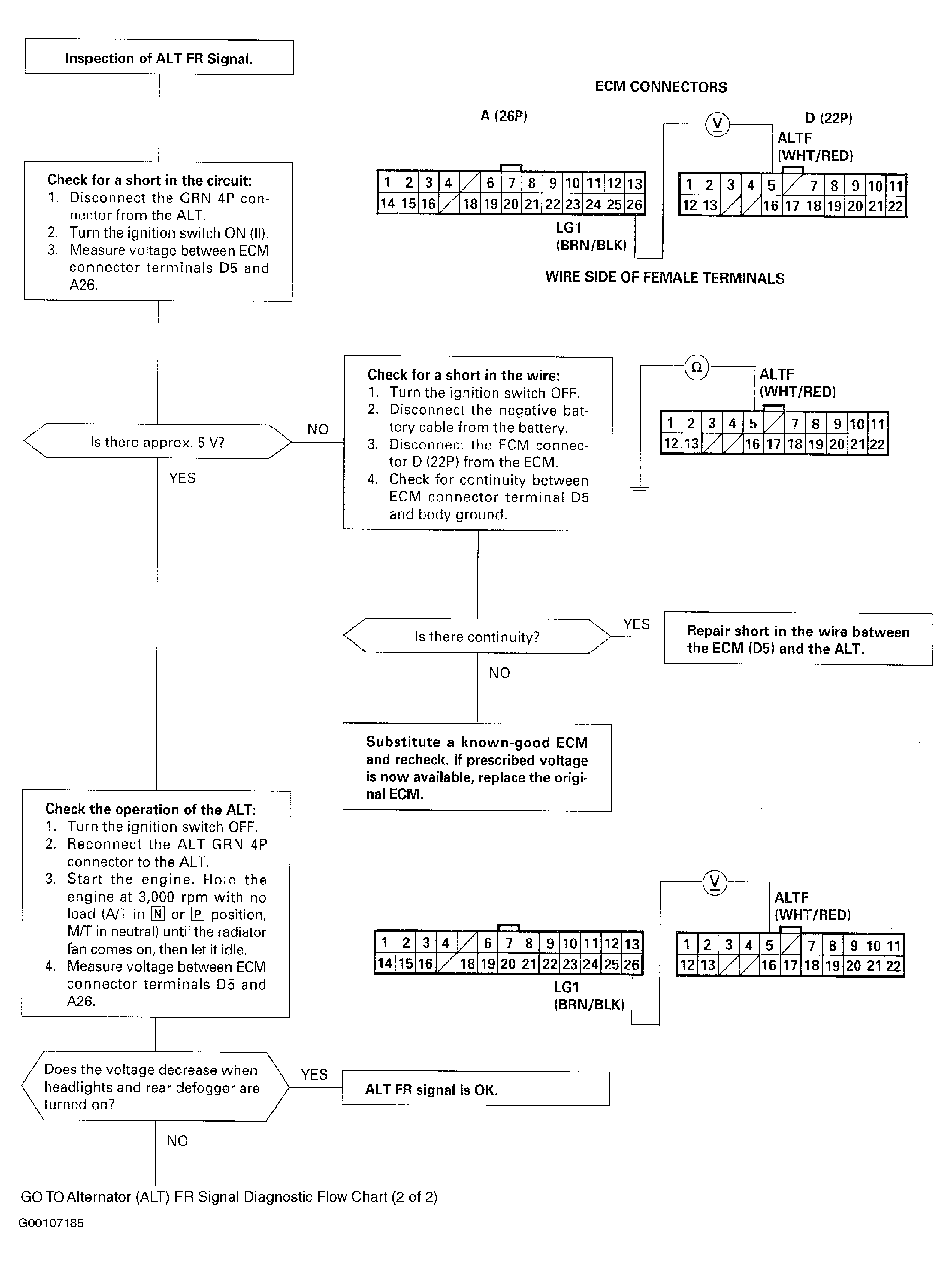 This signals the ECM when the alternator (ALT) is charging. For troubleshooting of the FR signal circuit, see Fig 1 and Fig 2 .