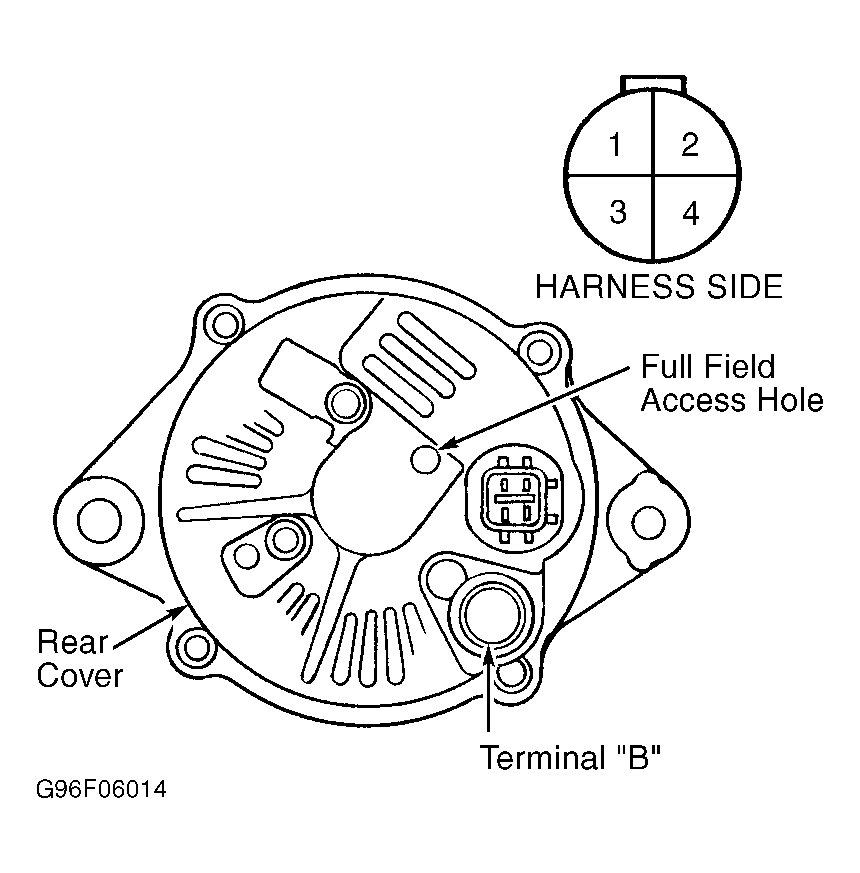 5. With engine speed still at 2000 RPM, full field generator. Insert test probe into full field access hole, located on back of generator. See Figure. If 75 amps or more exist, replace voltage regulator. If less than 75 amps exist, test and repair generator components. See BENCH TESTING .