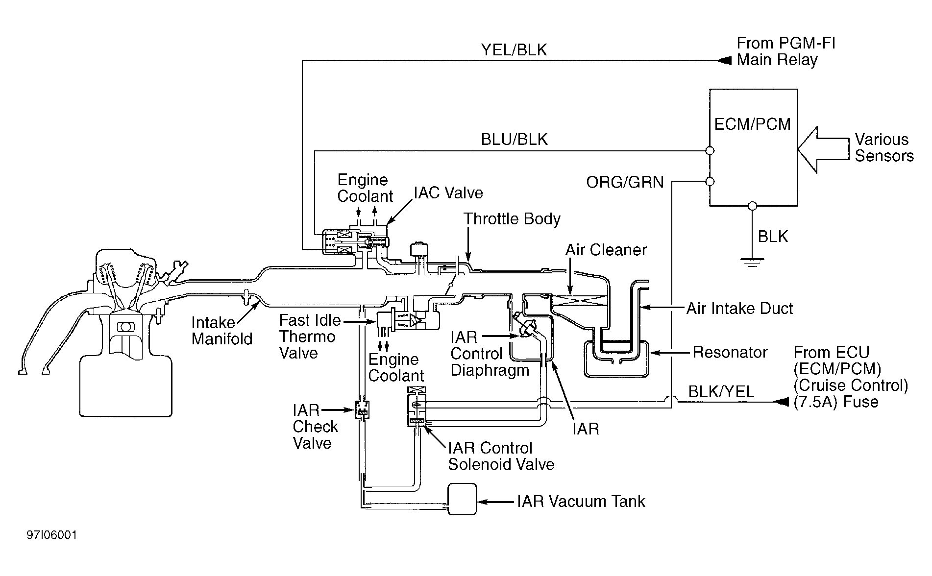- Increase engine speed to 4500 RPM. Check for vacuum at IAR control solenoid valve upper vacuum hose. If vacuum does not exist, allow engine to idle and go to next step. If vacuum exists, substitute a known good PCM, then recheck. If symptom or indication goes away, replace original PCM.