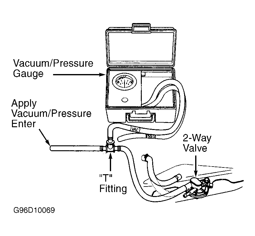 . Slowly pressurize vapor line while observing gauge. Pressure should momentarily stabilize (valve opens) within specified range. See EVAP 2-WAY VALVE STABILIZING PRESSURE