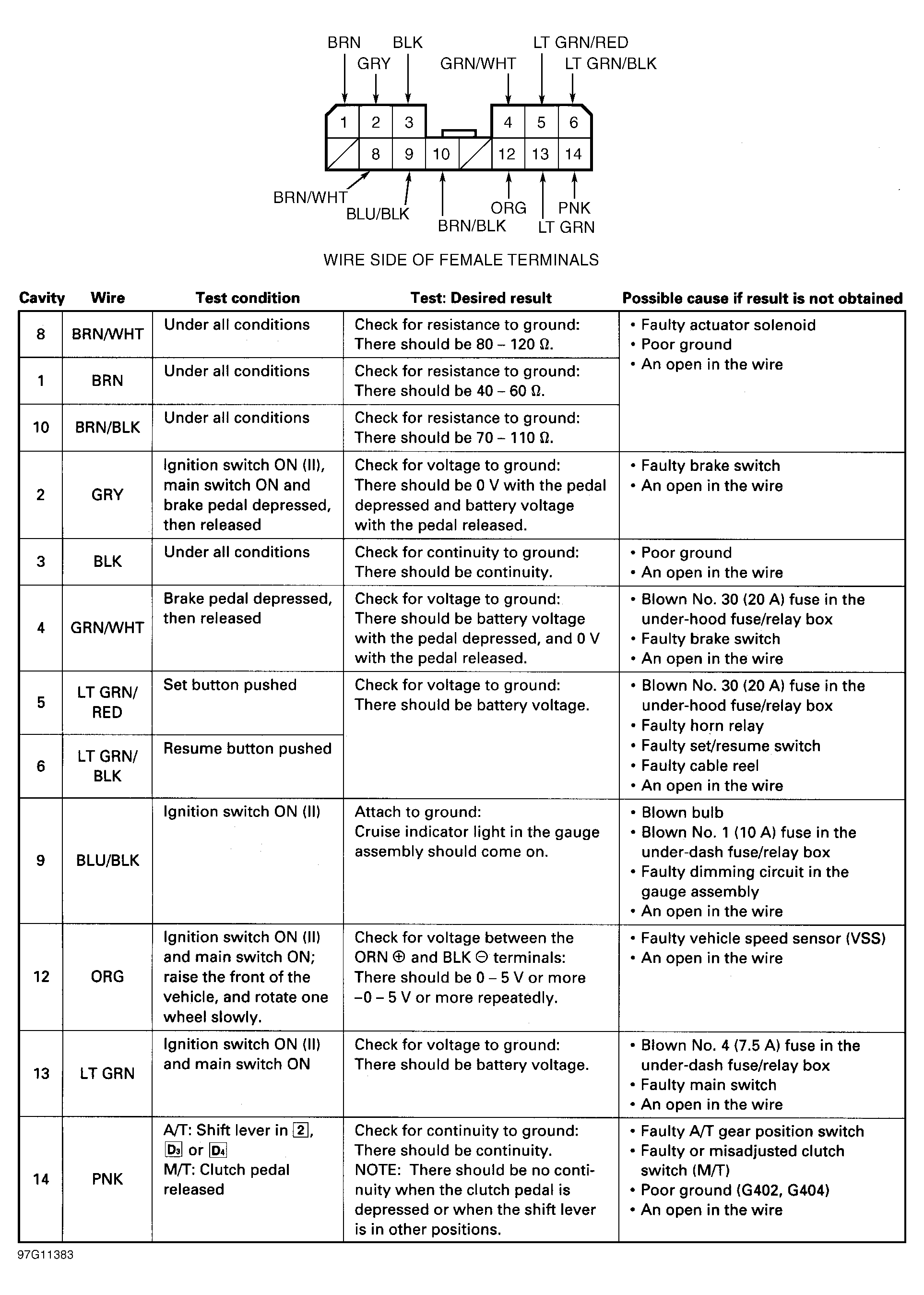 - Disconnect cruise control unit 14-pin connector. Ensure connector and terminals are okay. Repair as necessary and retest system. If connector and terminals are okay, perform cruise control unit input tests. See Fig 1