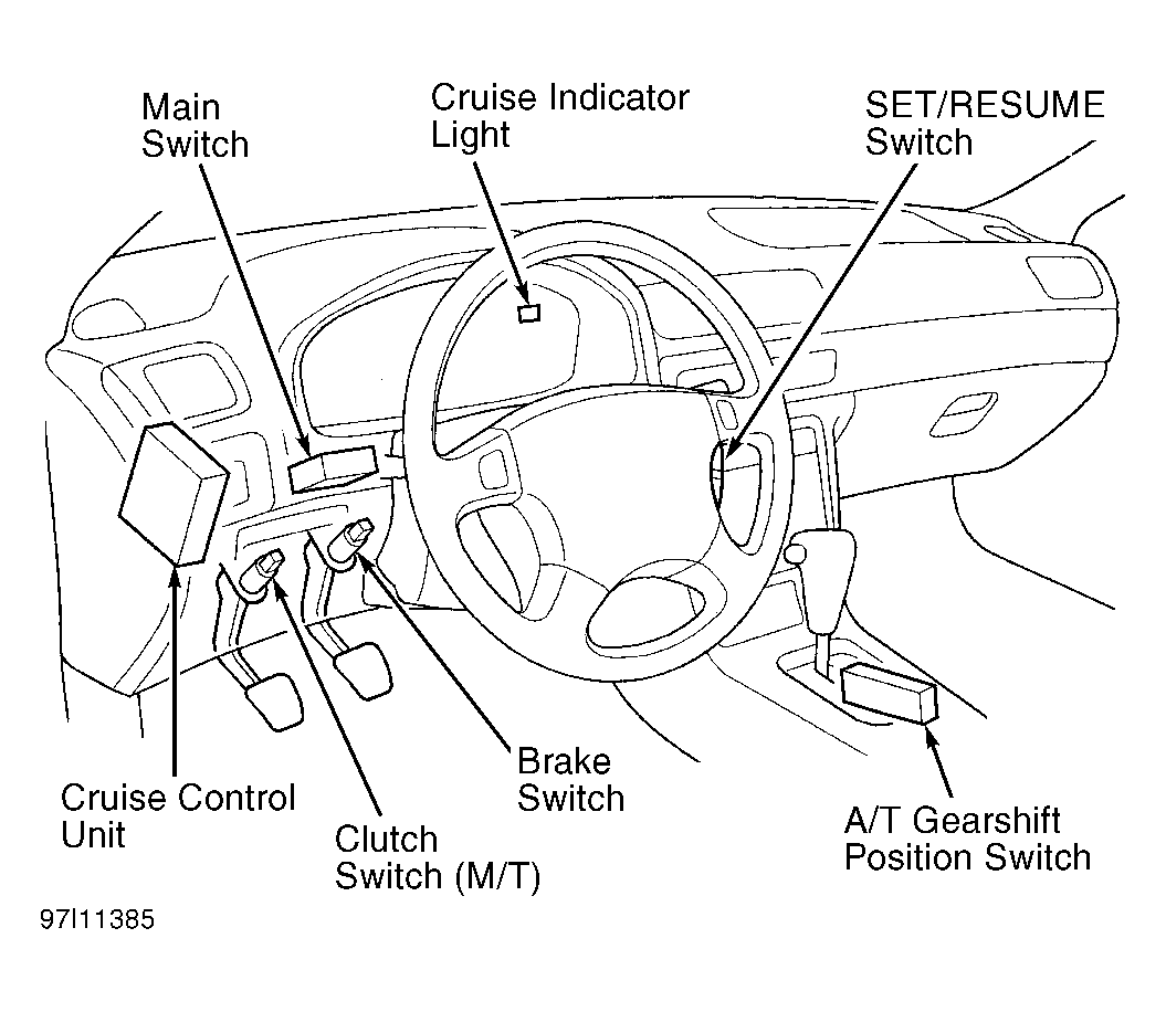- Disable air bag system. See appropriate AIR BAG RESTRAINT SYSTEMS article in the ACCESSORIES/SAFETY EQUIPMENT section. Turn ignition off. Remove instrument panel lower left cover. Remove left knee bolster. Cruise control unit is located near left kick panel. See Figure