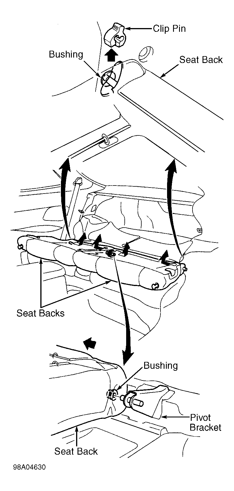 1. Disconnect negative battery cable. On hatchback models, fold seat-backs forward. Remove clips securing trunk mat to seat-backs and remove trunk mat. Remove clip pin on both sides of seat. See Fig 1. Slide seat-backs outward and remove seat-backs from pivot bracket. See Fig 1. Remove bolts located behind center of seat cushion. Disconnect seat cushion securing hooks and seat cushion.