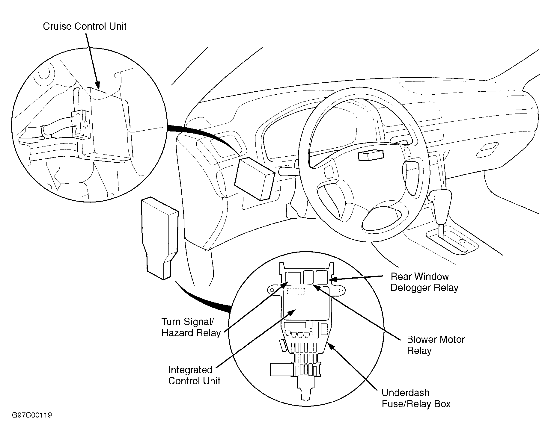 | Auxiliary Fuse Holder | On left side of underdash fuse/relay box. |